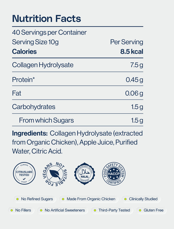 It's an all-natural goodness: Collagen hydrolysate from premium organic chicken,Pure apple juice,Purified water,Citric acid